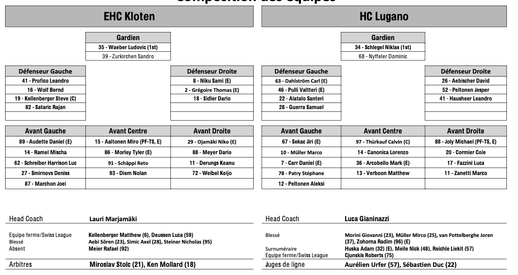 Formation des équipes et joueurs indisponibles pour le match Kloten vs Lugano 18/12/2024 Follow SwissHabs Derniers articles Il y a 4 heures Frölunda remporte la Champions Hockey League Il y a 5 heures Les plus beaux buts de la semaine écoulée en NHL Il y a 6 heures Un match de suspension et une amende contre Malte Strömwall Il y a 8 heures Ajoie et... La Chaux-de-Fonds auraient bien accueilli Chris DiDomenico Il y a 10 heures Ambri officialise le divorce avec Chris DiDomenico