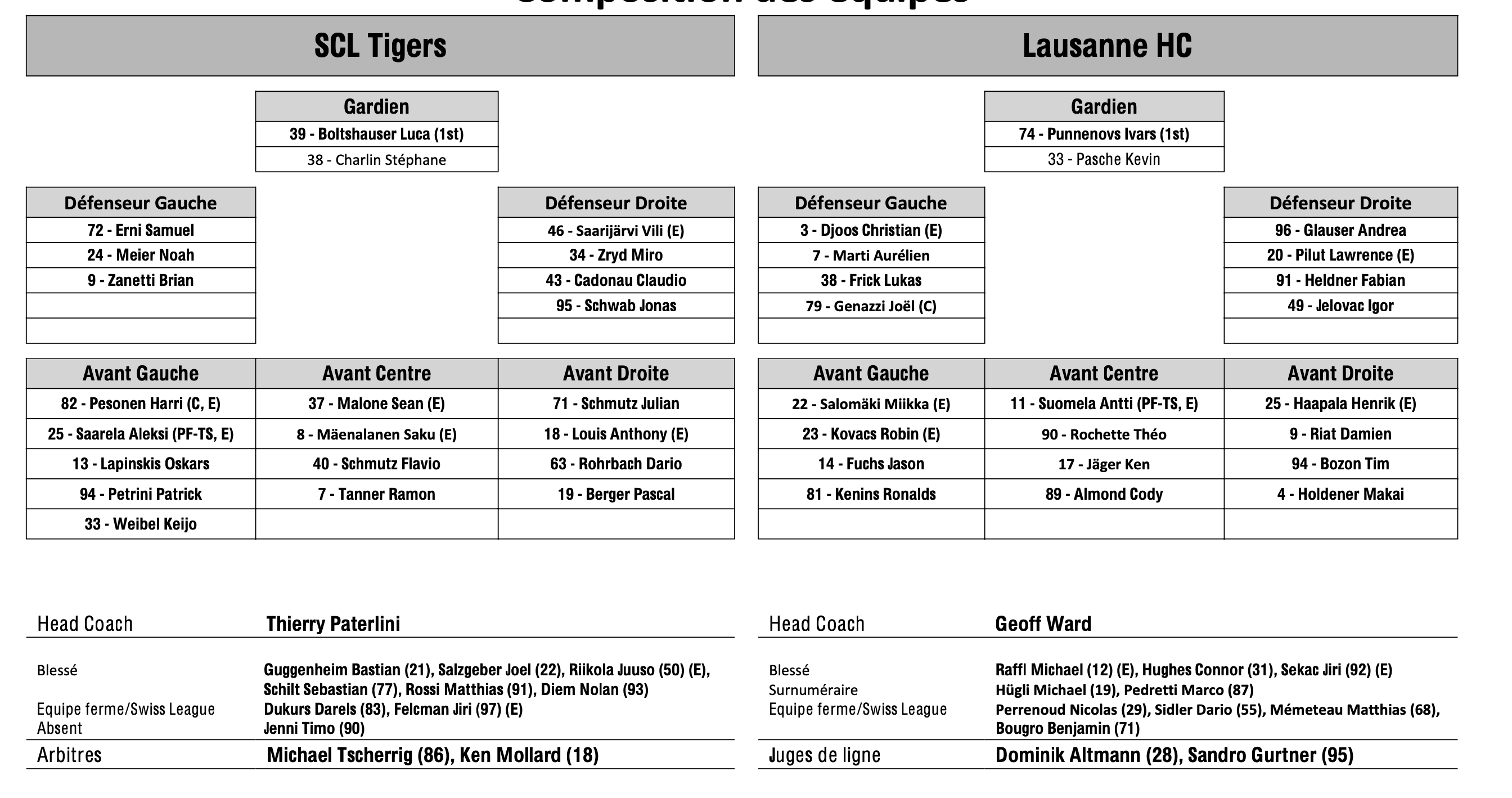 Formation des équipes et joueurs indisponibles pour le match Langnau vs Lausanne 21/12/2023 Follow SwissHabs Derniers articles Il y a 10 heures Formation des équipes et joueurs indisponibles pour le match Berne vs Fribourg Il y a 10 heures Formation des équipes et joueurs indisponibles pour le match Rapperswil vs Ambri Il y a 10 heures Formation des équipes et joueurs indisponibles pour le match Genève vs Kloten Il y a 10 heures Formation des équipes et joueurs indisponibles pour le match Davos vs Bienne Il y a 10 heures Formation des équipes et joueurs indisponibles pour le match Lausanne vs Ajoie