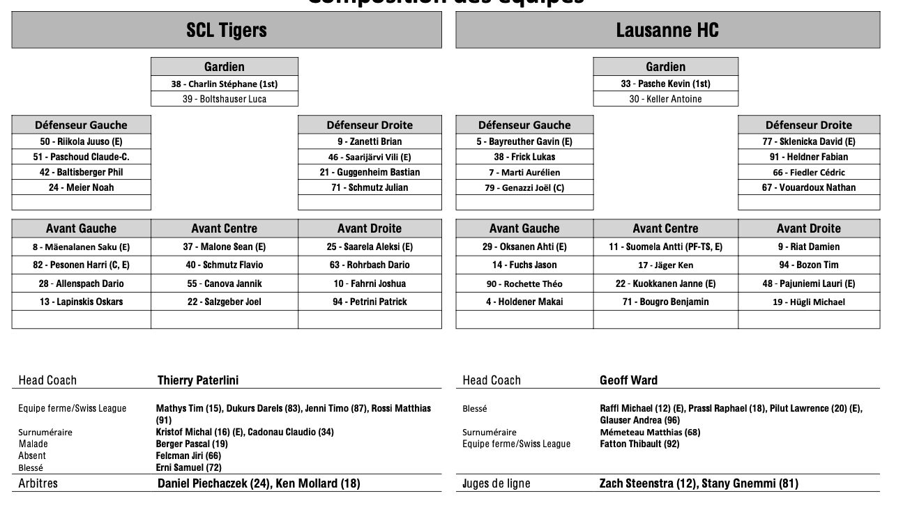 Formation des équipes et joueurs indisponibles pour le match Langnau vs Lausanne 23/12/2024 Follow SwissHabs Derniers articles Il y a une heure Peter Cajka nous livre ses impressions sur cette fin de saison régulière Il y a 4 heures Chris DiDomenico ne devrait plus reporter le maillot d'Ambri Il y a 4 heures Saison terminée pour Luca Hollenstein, un remplaçant déjà trouvé Il y a 4 heures Coire prolonge son buteur Liekit Reichle Il y a 6 heures Les autres faits à retenir de cette nuit de NHL et de celle à venir