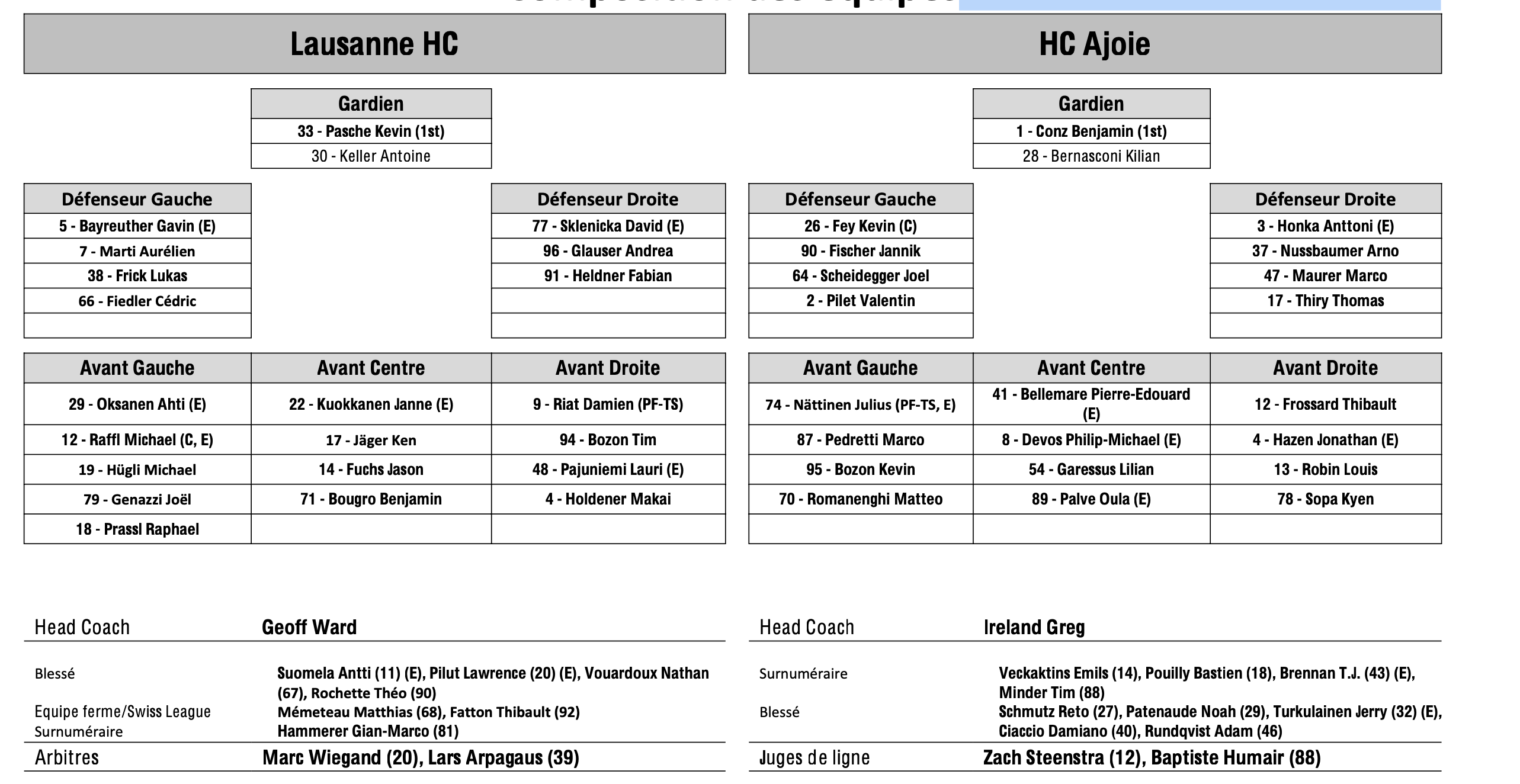 Formation des équipes et joueurs indisponibles pour le match Lausanne vs Ajoie 18/01/2025 Follow SwissHabs Derniers articles Il y a 15 minutes Ouverture d'une procédure ordinaire contre Malte Strömwall Il y a 39 minutes Emil Pettersson suscite de l'intérêt sur le marché suisse Il y a une heure Les autres faits à retenir de cette nuit de NHL et de celle à venir Il y a une heure Mauvais timing pour aller chercher sa crosse Il y a une heure Un combat de gardien en AHL