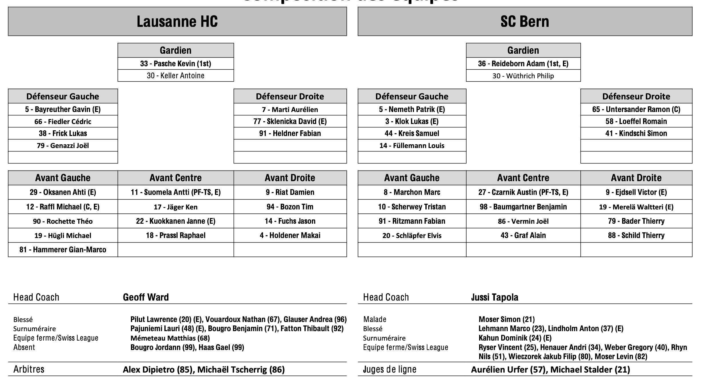Formation des équipes et joueurs indisponibles pour le match Lausanne vs Berne 24/01/2025 Follow SwissHabs Derniers articles Il y a une heure Zoug dévoile son nouveau logo Il y a une heure Deux prolongations à Zurich Il y a 3 heures Formation des équipes et joueurs indisponibles pour le match Zurich vs Genève Il y a 4 heures Formation des équipes et joueurs indisponibles pour le match Davos vs Kloten Il y a 4 heures Formation des équipes et joueurs indisponibles pour le match Lugano vs Lausanne