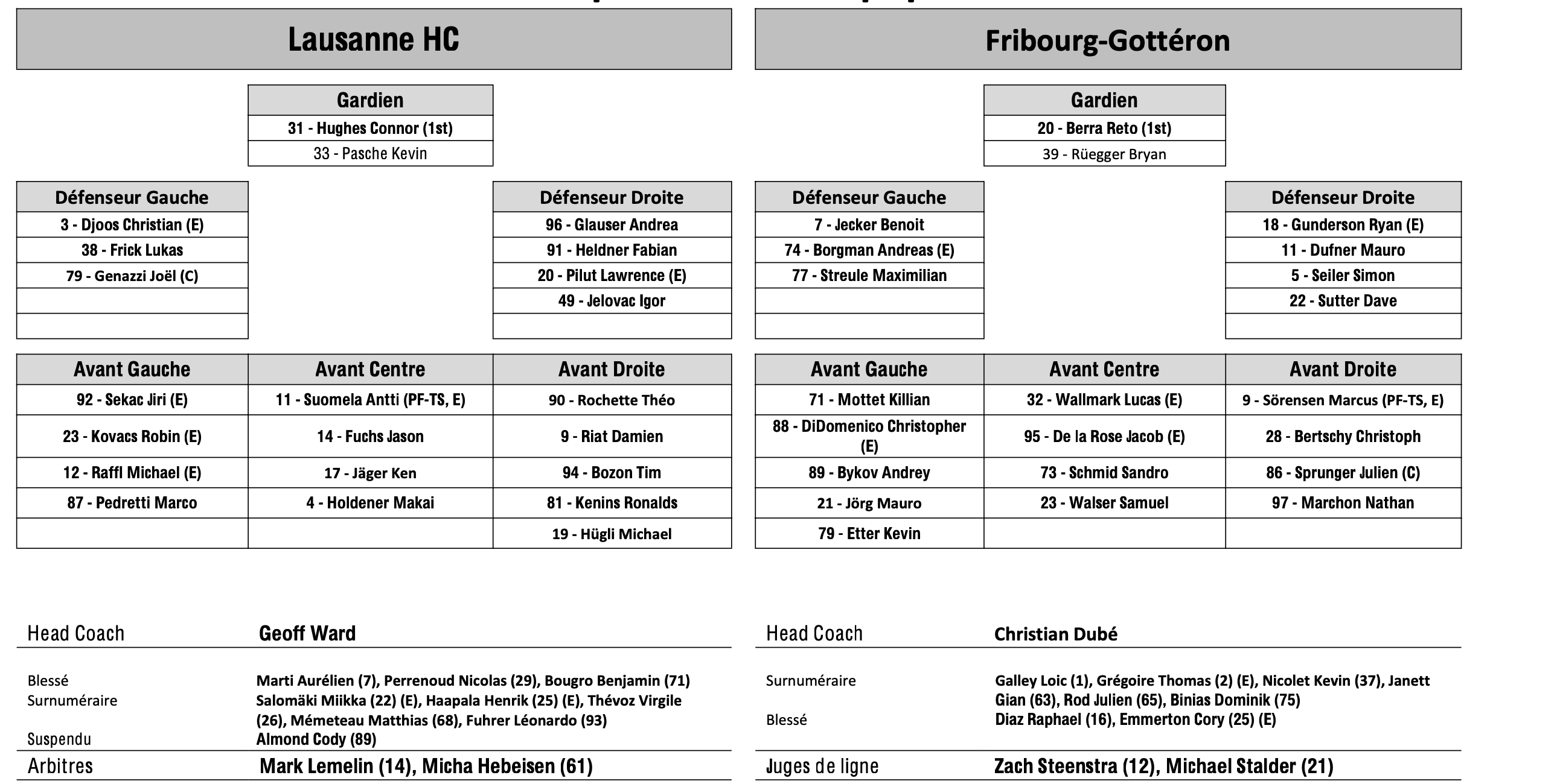 Formation des équipes et joueurs indisponibles pour le match Lausanne vs Fribourg 03/04/2024 Follow SwissHabs Derniers articles Il y a 13 minutes Le combat de Jason Zucker vs Jonas Siegenthaler en images Il y a une heure Ian Michtell devrait rejoindre Berne la saison prochaine Il y a 5 heures Le point sur l'infirmerie du HC Bienne Il y a 6 heures Trois nouveaux intronisés au Hall of Fame de Genève Il y a 8 heures Women's League : début des pré-play-offs, les play-out n’auront pas lieu