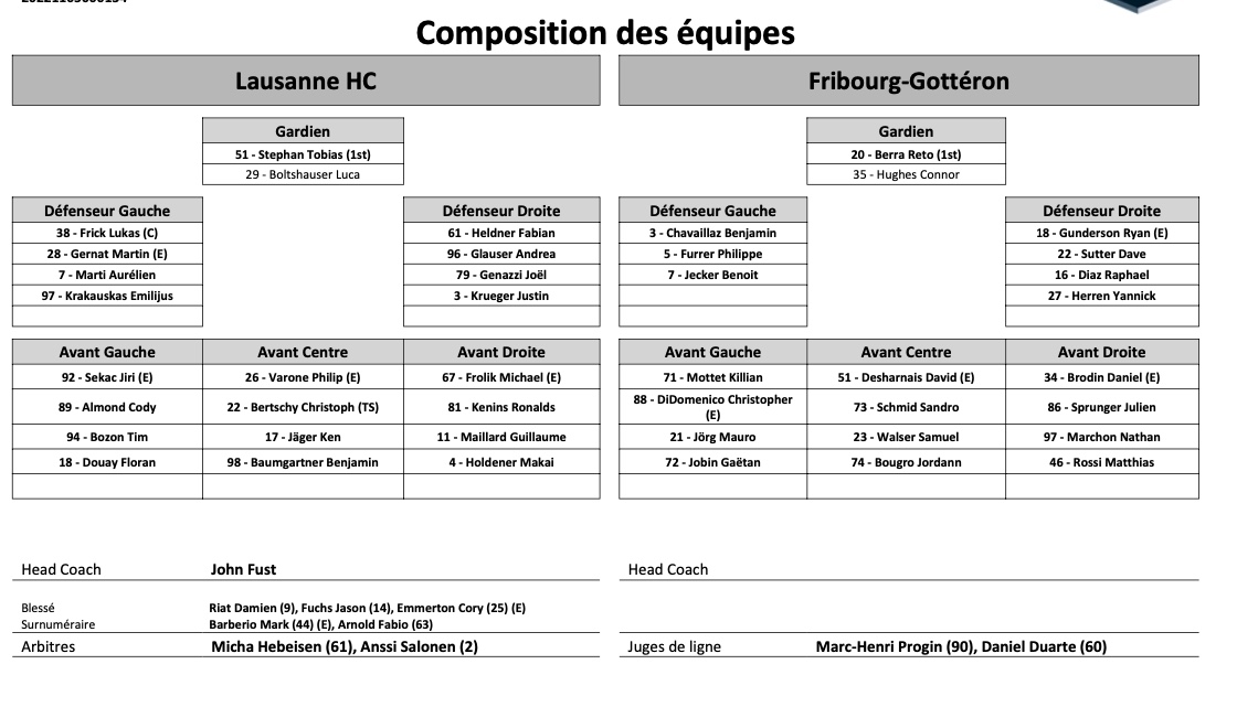 Formation des équipes et joueurs indisponibles pour le match Lausanne vs Fribourg 02/11/2021 Follow SwissHabs Derniers articles Il y a 52 minutes Nicole Vallario prend du gallon à New-York, Kira Juodikis rejoint l'équipe Il y a 4 heures Mathieu Maret rejoint Martigny Il y a 5 heures Toujours l'incertitude autour d'Enzo Corvi Il y a 5 heures Un nouvel heureux événement pour Kevin Fiala et sa famille Il y a 10 heures Les autres faits à retenir de cette nuit de NHL