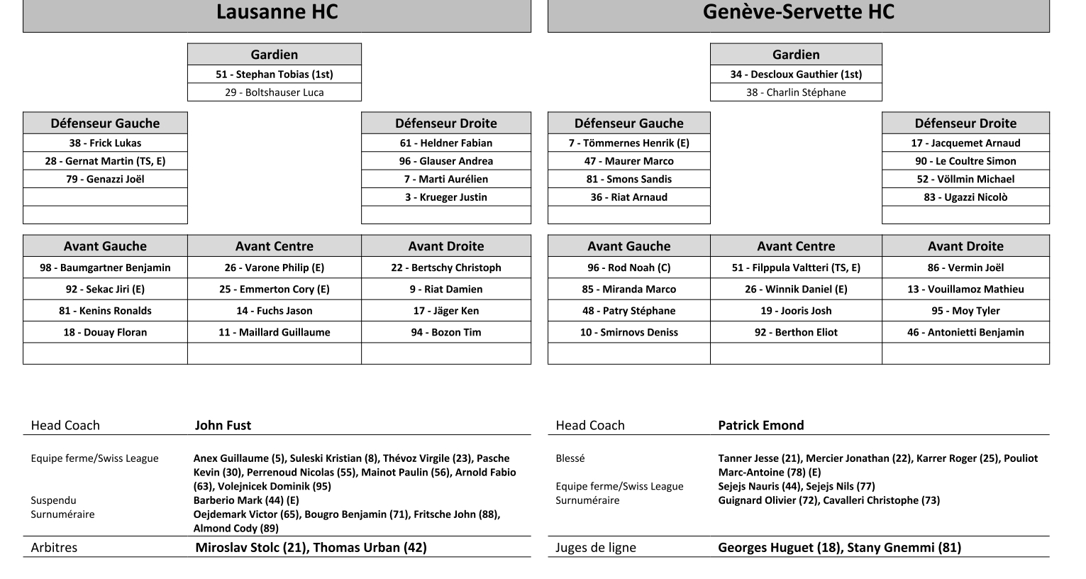 Formation des équipes et joueurs indisponibles pour le match Lausanne vs Genève 17/09/2021 Follow SwissHabs Derniers articles Il y a une heure Les autres faits à retenir de cette nuit de NHL et de celle à venir Il y a 2 heures Dan Tangnes signe un bien bel exploit avec Rögle Il y a 2 heures Une 21e saison à plus d'un point par match pour Sidney Crosby Il y a 2 heures Les Devils stoppent la série du Canadien Il y a 2 heures Saison terminée pour Maxime Sauthier, les Huskies devront passer par un septième match