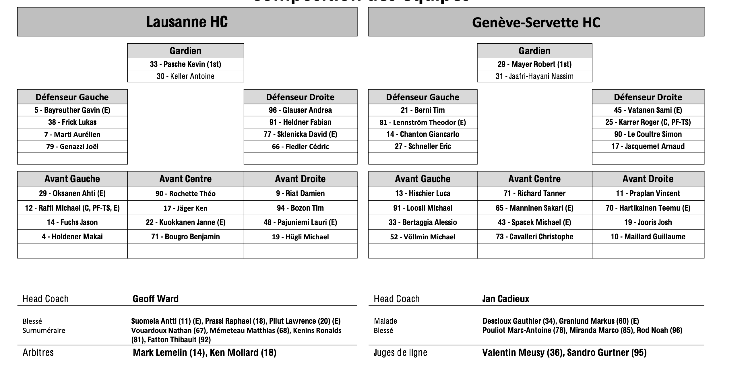 Formation des équipes et joueurs indisponibles pour le match Lausanne vs Genève 17/09/2024 Follow SwissHabs Derniers articles Il y a 3 heures La saison de NHL de Nino Niederreiter serait terminée Il y a 3 heures Les images des matchs de la soirée en National League Il y a 9 heures Formation des équipes et joueurs indisponibles pour le match Bienne vs Zoug Il y a 9 heures Formation des équipes et joueurs indisponibles pour le match Rapperswil vs Fribourg Il y a 9 heures Formation des équipes et joueurs indisponibles pour le match Kloten vs Langnau