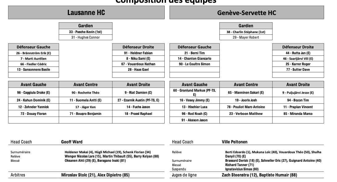 Formation des équipes et joueurs indisponibles pour le match Lausanne vs Genève 31/03/2026 Follow SwissHabs Derniers articles Il y a une heure Finale de Swiss League acte II : formation des équipes pour le match La Chaux-de-Fonds vs Sierre Il y a une heure Formation des équipes et joueurs indisponibles pour le match Lausanne vs Genève Il y a 2 heures Formation des équipes et joueurs indisponibles pour le match Ajoie vs Ambri Il y a 3 heures La sélection suisse U18 pour la préparation aux Mondiaux Il y a 3 heures La ligue a été clémente avec Simas Ignatavicius
