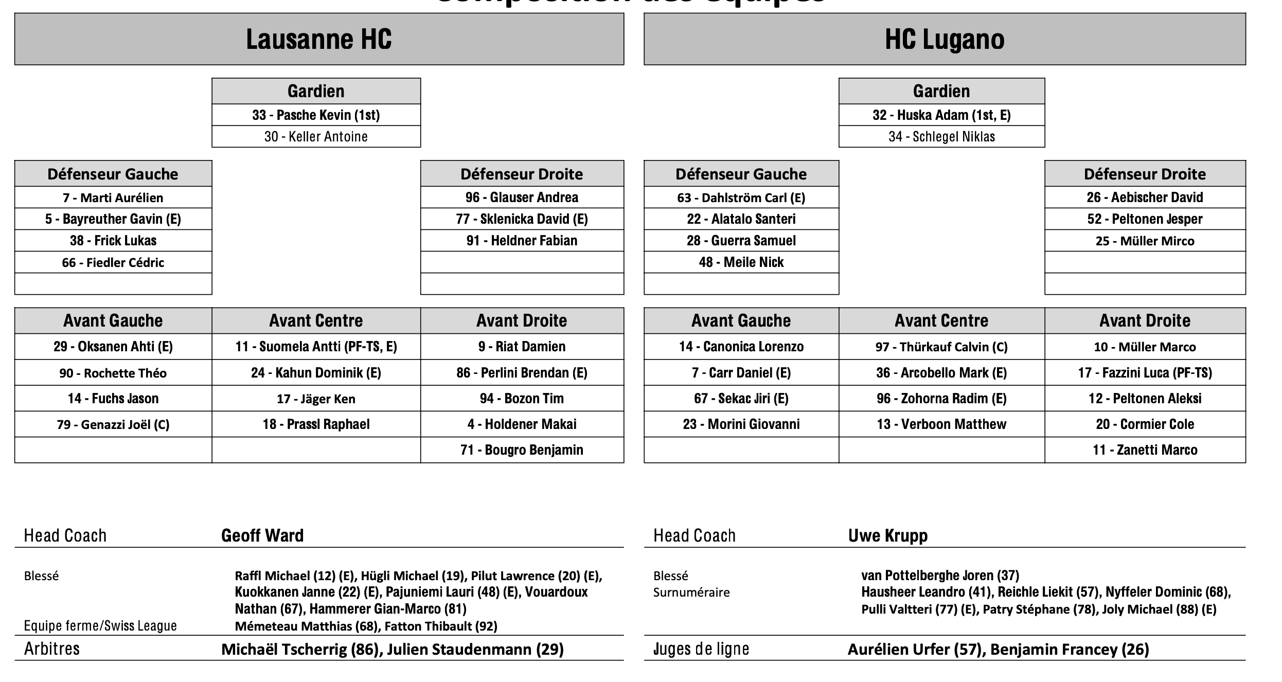 Formation des équipes et joueurs indisponibles pour le match Lausanne vs Lugano 21/02/2025 Follow SwissHabs Derniers articles Il y a 55 minutes Martin Filander continuera sans doute son parcours en Suède Il y a une heure Jacob de la Rose incertain pour le match de demain Il y a 3 heures Fribourg-Gottéron engage un nouvel étranger Il y a 5 heures Colin Lindemann prolonge son contrat avec Zoug jusqu'en 2028 Il y a 6 heures Jannik Fischer prendra sa retraite à la fin de la saison