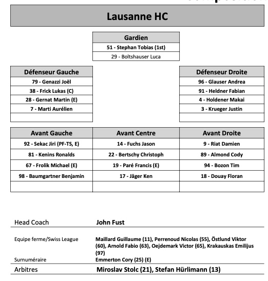 Formation des équipes et joueurs indisponibles pour le match Lausanne vs Rapperswil 26/02/2022 Follow SwissHabs Derniers articles Il y a une heure Les autres faits à retenir de cette nuit de NHL et de celle à venir Il y a une heure Damiano Ciaccio n’est pas encore prêt à raccrocher les patins Il y a 2 heures Janis Moser toujours aussi solide, Akira Schmid retrouve l'action en cours de match pour signer un blanchissage Il y a 3 heures Matthew Schaefer continue à écrire l'histoire de la NHL Il y a 3 heures Auston Matthews n'a pas échappé à l'opération