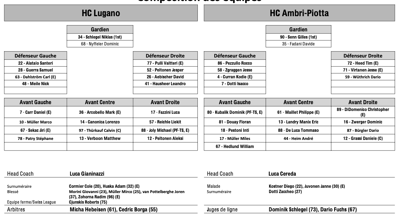 Formation des équipes et joueurs indisponibles pour le match Lugano vs Ambri 23/12/2024 Follow SwissHabs Derniers articles Il y a une heure Peter Cajka nous livre ses impressions sur cette fin de saison régulière Il y a 4 heures Chris DiDomenico ne devrait plus reporter le maillot d'Ambri Il y a 4 heures Saison terminée pour Luca Hollenstein, un remplaçant déjà trouvé Il y a 4 heures Coire prolonge son buteur Liekit Reichle Il y a 6 heures Les autres faits à retenir de cette nuit de NHL et de celle à venir