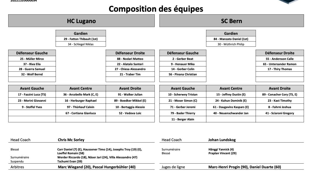 Formation des équipes et joueurs indisponibles pour le match Lugano vs Berne 25/09/2021 Follow SwissHabs Derniers articles Il y a une heure Les Islanders changent de cap : Peter DeBoer remplace Patrick Roy Il y a 7 heures Des sanctions contre Sandro Aeschlimann, Igor Jelovac, Marlon Graf et Julien Sprunger Il y a 8 heures Chris McSorley et Genève-Servette renvoyés dos à dos Il y a 9 heures Nicole Vallario et les Sirens jouent devant 18'000 fans dans une arène mythique Il y a 11 heures Andres Ambühl va prendre une place importante dans la Coupe Spengler