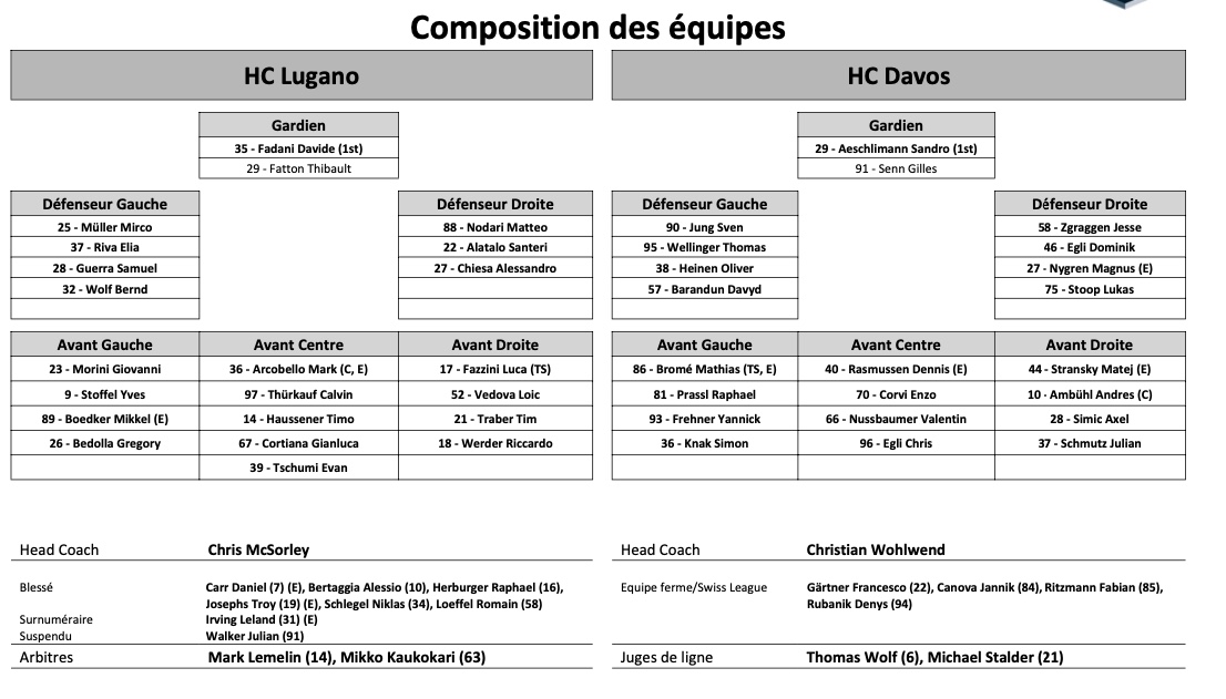 Formation des équipes et joueurs indisponibles pour le match Lugano vs Davos 16/10/2021 Follow SwissHabs Derniers articles Il y a 6 heures Genève file également en demi finale Il y a 10 heures Formation des équipes et joueurs indisponibles pour le match Genève vs Lausanne Il y a 10 heures Finale de Swiss League acte III : formation des équipes et joueurs indisponibles pour le match Sierre vs La Chaux-de-Fonds Il y a 11 heures L'équipe universitaire de retour pour deux ans à la Coupe Spengler Il y a 13 heures Champions Hockey League : les challengers