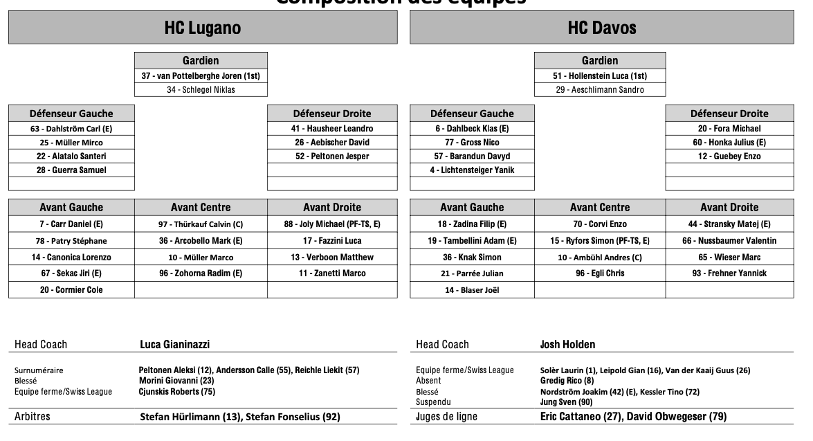 Formation des équipes et joueurs indisponibles pour le match Lugano vs Davos 19/09/2024 Follow SwissHabs Derniers articles Il y a 6 heures La saison de NHL de Nino Niederreiter serait terminée Il y a 6 heures Les images des matchs de la soirée en National League Il y a 12 heures Formation des équipes et joueurs indisponibles pour le match Bienne vs Zoug Il y a 12 heures Formation des équipes et joueurs indisponibles pour le match Rapperswil vs Fribourg Il y a 12 heures Formation des équipes et joueurs indisponibles pour le match Kloten vs Langnau