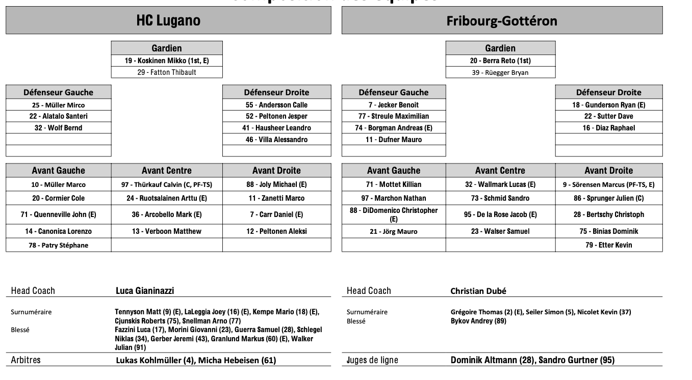 Formation des équipes et joueurs indisponibles pour le match Lugano vs Fribourg 29/02/2024 Follow SwissHabs Derniers articles Il y a 38 minutes Suspension provisionnelle et ouverture d'une procédure contre Loïc In-Albon Il y a 2 heures Les Lausannoises évolueront en PostFinance Women’s League Il y a 5 heures Les autres faits à retenir de cette nuit de NHL et de celle à venir Il y a 5 heures La famille Fiala va s'agrandir Il y a 5 heures Contrats d'entrée en NHL pour deux espoirs de la WHL