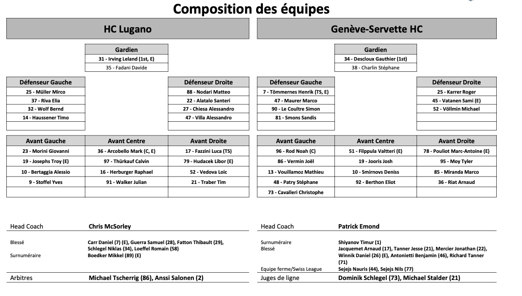 Formation des équipes et joueurs indisponibles pour le match Lugano vs Genève 30/10/2021 Follow SwissHabs Derniers articles Il y a 4 heures Formation des équipes et joueurs indisponibles pour le match Fribourg vs Rapperswil Il y a 6 heures Nicole Vallario prend du gallon à New-York, Kira Juodikis rejoint l'équipe Il y a 10 heures Mathieu Maret rejoint Martigny Il y a 11 heures Toujours l'incertitude autour d'Enzo Corvi Il y a 11 heures Un nouvel heureux événement pour Kevin Fiala et sa famille