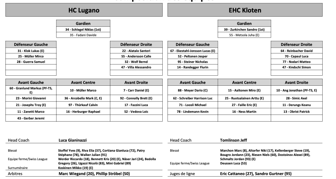 Formation des équipes et joueurs indisponibles pour le match Lugano vs Kloten 04/02/2023 Follow SwissHabs Derniers articles Il y a 5 heures Formation des équipes et joueurs indisponibles pour le match Bienne vs Zoug Il y a 5 heures Formation des équipes et joueurs indisponibles pour le match Rapperswil vs Fribourg Il y a 5 heures Formation des équipes et joueurs indisponibles pour le match Kloten vs Langnau Il y a 5 heures Formation des équipes et joueurs indisponibles pour le match Lausanne vs Zurich Il y a 5 heures Formation des équipes et joueurs indisponibles pour le match Ajoie vs Lugano