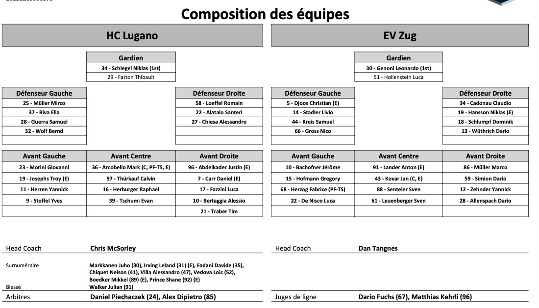 Formation des équipes et joueurs indisponibles pour le match Lugano vs Zoug 31/03/2022 Follow SwissHabs Derniers articles Il y a 12 minutes Alina Mueller perd sa coéquipière autrichienne Il y a 27 minutes Les fans des Rangers n'ont bien entendu pas oublié Artemi Panarin Il y a 58 minutes Un sacré combat entre Lian Bichsel et Jack McBain Il y a une heure Une victoire en prolongation pour les Devils Il y a une heure Les images de la victoire de Rapperswil à Berne