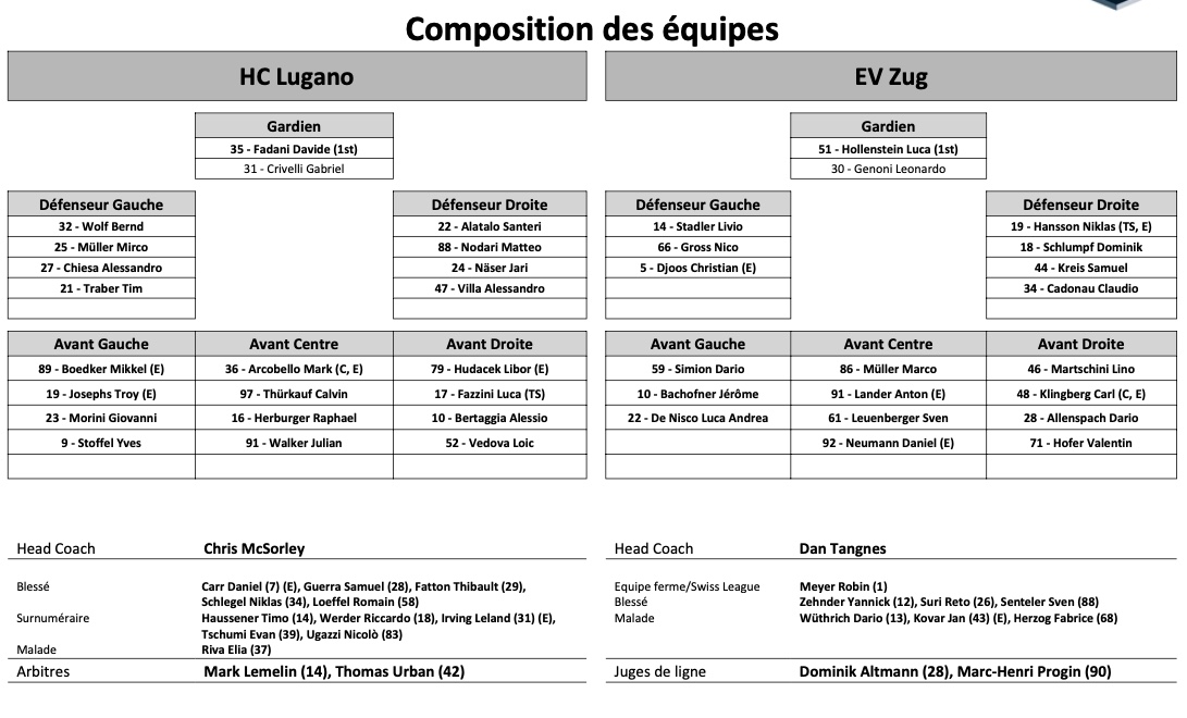 Formation des équipes et joueurs indisponibles pour le match Lugano vs Zoug 23/10/2021 Follow SwissHabs Derniers articles Il y a une heure Victor Söderström devrait évoluer en Suisse la saison prochaine Il y a 4 heures Cinq matchs de suspension et une amende contre Patrik Nemeth Il y a 4 heures Noemi Neubauerová rejoint Alina Müller Il y a 6 heures Alex Formenton, Stéphane Charlin et Markus Granlund sanctionnés par la ligue Il y a 6 heures Melanie Häfliger quitte la Swiss Ice Hockey Federation