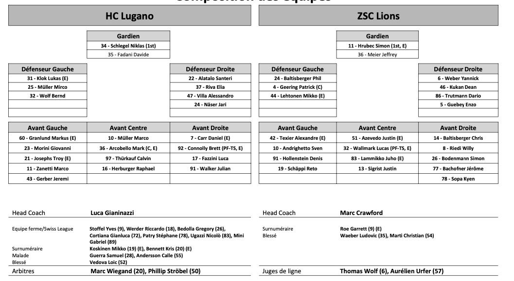 Formation des équipes et joueurs indisponibles pour le match Lugano vs Zurich 20/01/2023 Follow SwissHabs Derniers articles Il y a 46 minutes Davos pourrait signer un nouveau record de National League Il y a 2 heures Rikard Grönborg ne pourra plus parler à ses joueurs trois matchs durant Il y a 3 heures Martin Filander continuera sans doute son parcours en Suède Il y a 4 heures Jacob de la Rose incertain pour le match de demain Il y a 6 heures Fribourg-Gottéron engage un nouvel étranger
