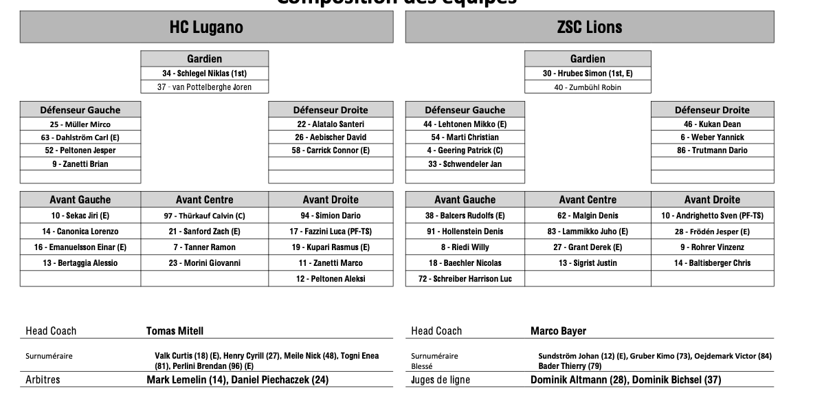 Formation des équipes et joueurs indisponibles pour le match Lugano vs Zurich 23/03/2026 Follow SwissHabs Derniers articles Il y a une heure Formation des équipes et joueurs indisponibles pour le match Lugano vs Zurich Il y a une heure Formation des équipes et joueurs indisponibles pour le match Lausanne vs Genève Il y a 2 heures Martigny ne compte pas stagner en 1ère ligue trop longtemps Il y a 3 heures Trois contrats d'entrée paraphés en NHL Il y a 5 heures Les Hurricanes et le Kraken se rendront à Helsinki pour la NHL Global Series