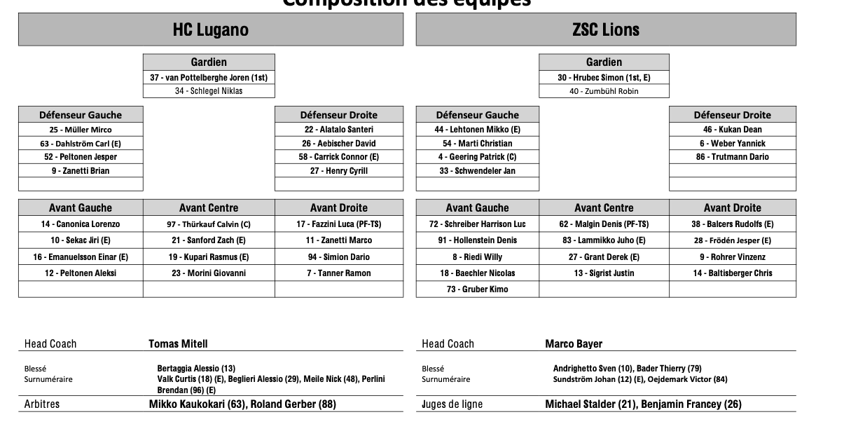 Formation des équipes et joueurs indisponibles pour le match Lugano vs Zurich 27/03/2026 Follow SwissHabs Derniers articles Il y a une heure Lino Martschini vise un nouveau contrat après sa grave blessure Il y a une heure Formation des équipes et joueurs indisponibles pour le match Lausanne vs Genève Il y a une heure Formation des équipes et joueurs indisponibles pour le match Lugano vs Zurich Il y a 3 heures Le HC Kloten complète son staff d'entraîneurs pour la saison à venir Il y a 3 heures Marcel Jenni assistera également Jan Cadieux
