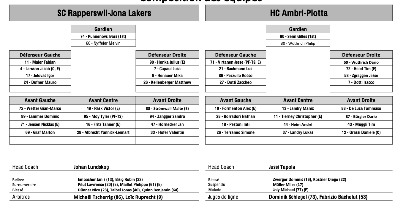 Formation des équipes et joueurs indisponibles pour le match Rapperswil vs Ambri 09/03/2026 Follow SwissHabs Derniers articles Il y a 2 heures Formation des équipes et joueurs indisponibles pour le match Berne vs Fribourg Il y a 2 heures Formation des équipes et joueurs indisponibles pour le match Rapperswil vs Ambri Il y a 2 heures Formation des équipes et joueurs indisponibles pour le match Genève vs Kloten Il y a 2 heures Formation des équipes et joueurs indisponibles pour le match Davos vs Bienne Il y a 2 heures Formation des équipes et joueurs indisponibles pour le match Lausanne vs Ajoie