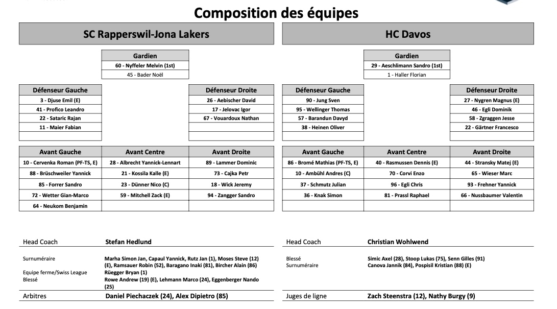Formation des équipes et joueurs indisponibles pour le match Rapperswil vs Davos 25/03/2022 Follow SwissHabs Derniers articles Il y a 30 minutes Les Oilers perdent Leon Draisaitl Il y a 36 minutes Le bilan de fin de saison de Martin Steinegger Il y a 2 heures Le Wild pourrait tenter de signer Auston Matthews Il y a 4 heures HC Ajoie : la liste des blessés s'amenuise Il y a 5 heures Les détails des championnats du Monde Féminins 2026