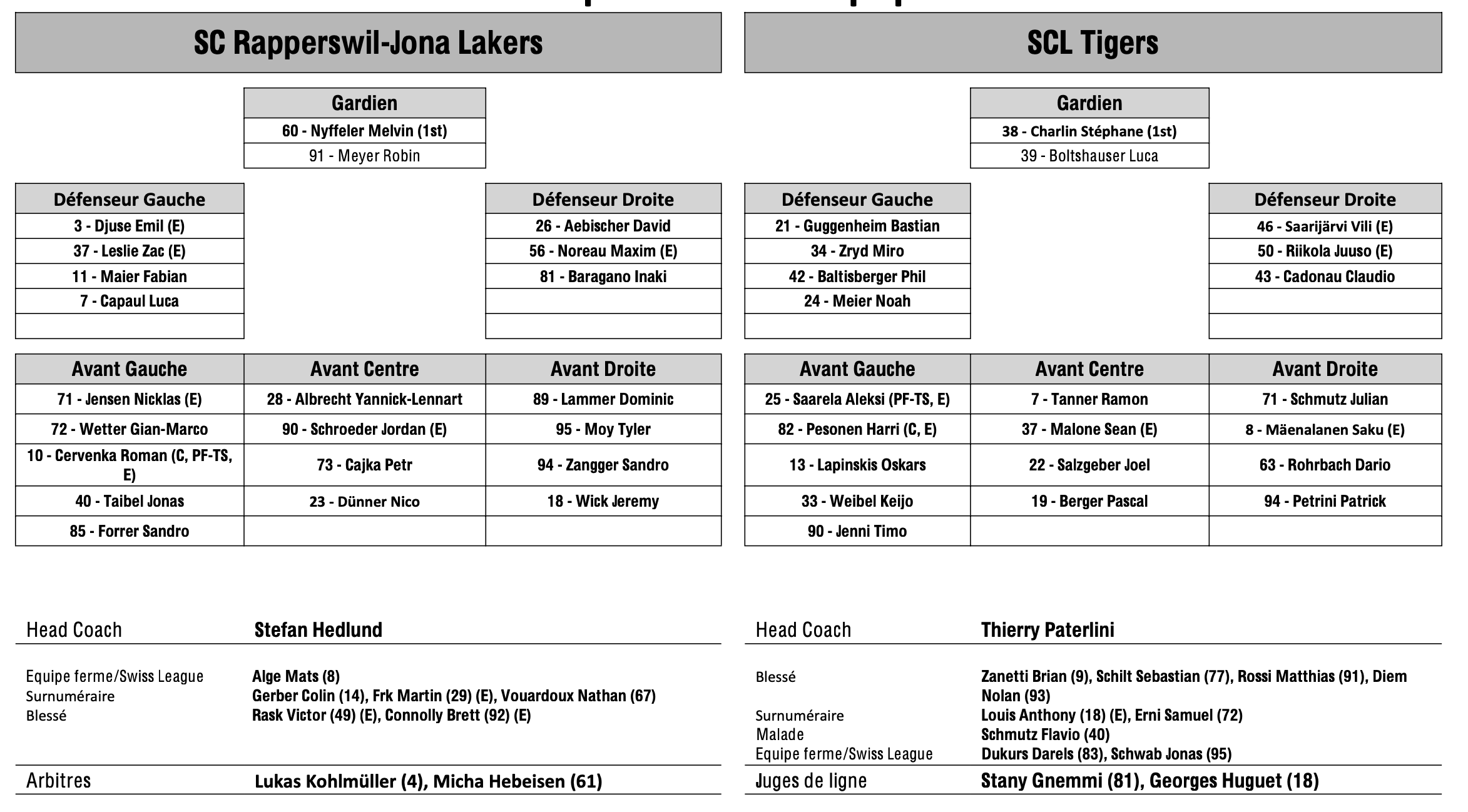Formation des équipes et joueurs indisponibles pour le match Rapperswil vs Langnau 21/01/2024 Follow SwissHabs Derniers articles Il y a 34 minutes Lian Bichsel revient sur la période délicate qu'il a traversée lors de sa blessure Il y a une heure Loïc In-Albon prend quatre match de suspension Il y a 3 heures Les autres faits à retenir de cette nuit de NHL et de celle à venir Il y a 5 heures Jonathan Hazen devra patienter avant de connaître son avenir Il y a 5 heures Une victoire pour Jordan Forget, une défaite et un but pour Luca Nappiot