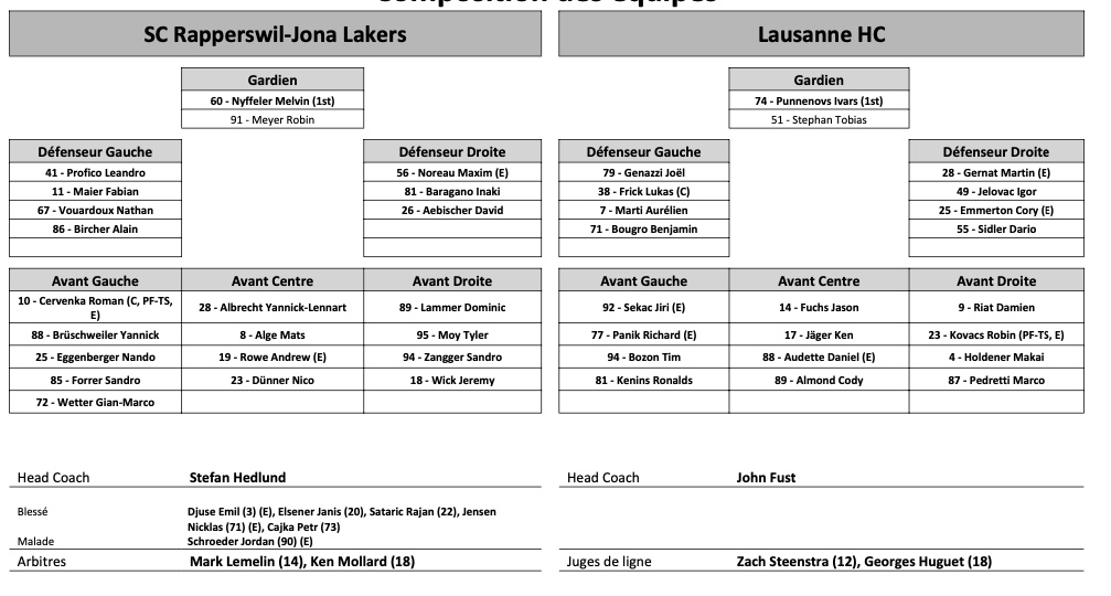 Formation des équipes et joueurs indisponibles pour le match Rapperswil vs Lausanne 01/11/2022 Follow SwissHabs Derniers articles Il y a 33 minutes Les autres faits à retenir de cette nuit de NHL et de celle à venir Il y a 58 minutes Un nouveau record d'affluence pour un match féminin aux États-Unis Il y a une heure Lars Steiner et Guus Van der Kaaij trouvent le fond des filets Il y a une heure Akira Schmid et les Golden Knights défaits par les Capitals Il y a 8 heures La saison de NHL de Nino Niederreiter serait terminée