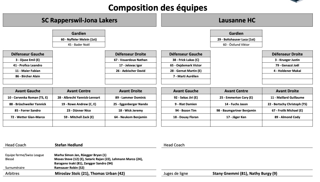 Formation des équipes et joueurs indisponibles pour le match Rapperswil vs Lausanne 20/12/2021 Follow SwissHabs Derniers articles Il y a une heure National League : Zurich file en demi-finale, Genève reprend l'avantage de la glace Il y a une heure Swiss League : une finale entre Sierre et la Chaux-de-Fonds Il y a 5 heures Lino Martschini vise un nouveau contrat après sa grave blessure Il y a 5 heures Formation des équipes et joueurs indisponibles pour le match Lausanne vs Genève Il y a 5 heures Formation des équipes et joueurs indisponibles pour le match Lugano vs Zurich
