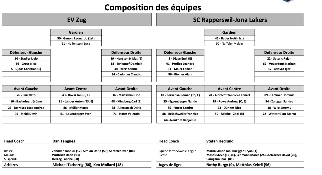 Formation des équipes et joueurs indisponibles pour le match Rapperswil vs Zoug 06/11/2021 Follow SwissHabs Derniers articles Il y a 46 minutes Les autres faits à retenir de cette nuit de NHL Il y a 47 minutes Ovechkin défie le temps et entre encore dans l’histoire Il y a une heure Un rare combat de gardiens en NHL Il y a une heure Le point sur les play-offs de Canadian Hockey League Il y a une heure Une soirée à oublier pour nos Suisses de NHL