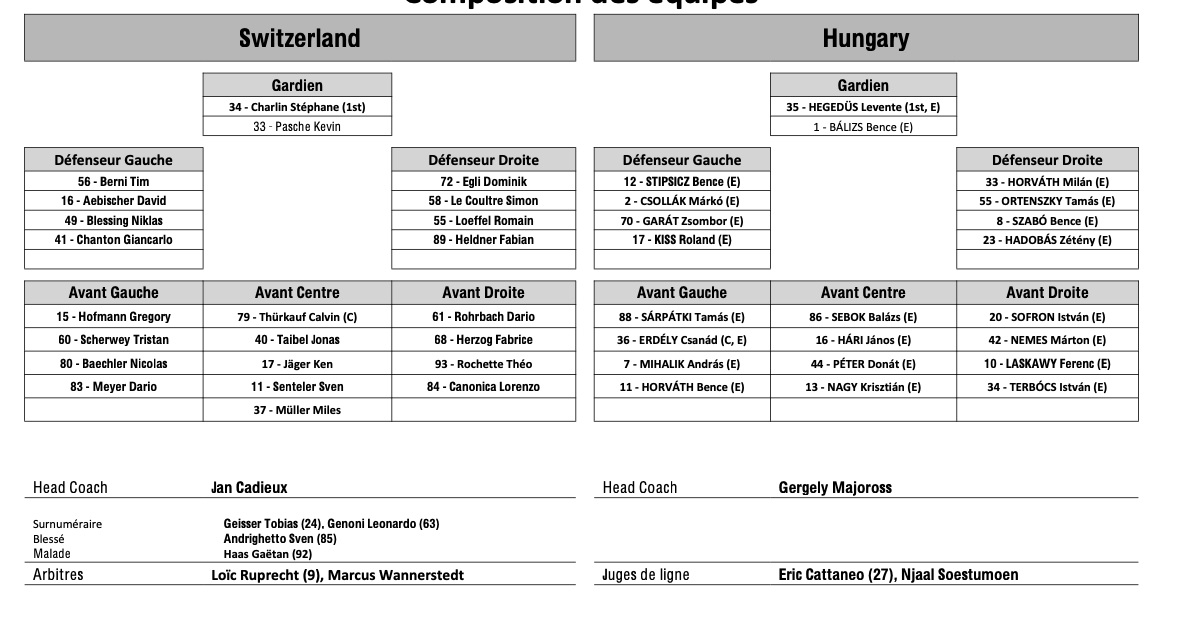 Formation des équipes et joueurs indisponibles pour le match Suisse - Hongrie 24/04/2026 Follow SwissHabs Derniers articles Il y a une heure Formation des équipes et joueurs indisponibles pour le match Suisse - Hongrie Il y a une heure Formation des équipes et joueurs indisponibles pour le match Fribourg vs Davos Il y a une heure Mondiaux U18 : la Suisse fête sa promotion avec un quasi sans faute Il y a 2 heures Une qualification et un hôte de marque pour Leon Muggli et les Bears Il y a 3 heures Les frères Krayem prolongent l'aventure avec le SC Langenthal