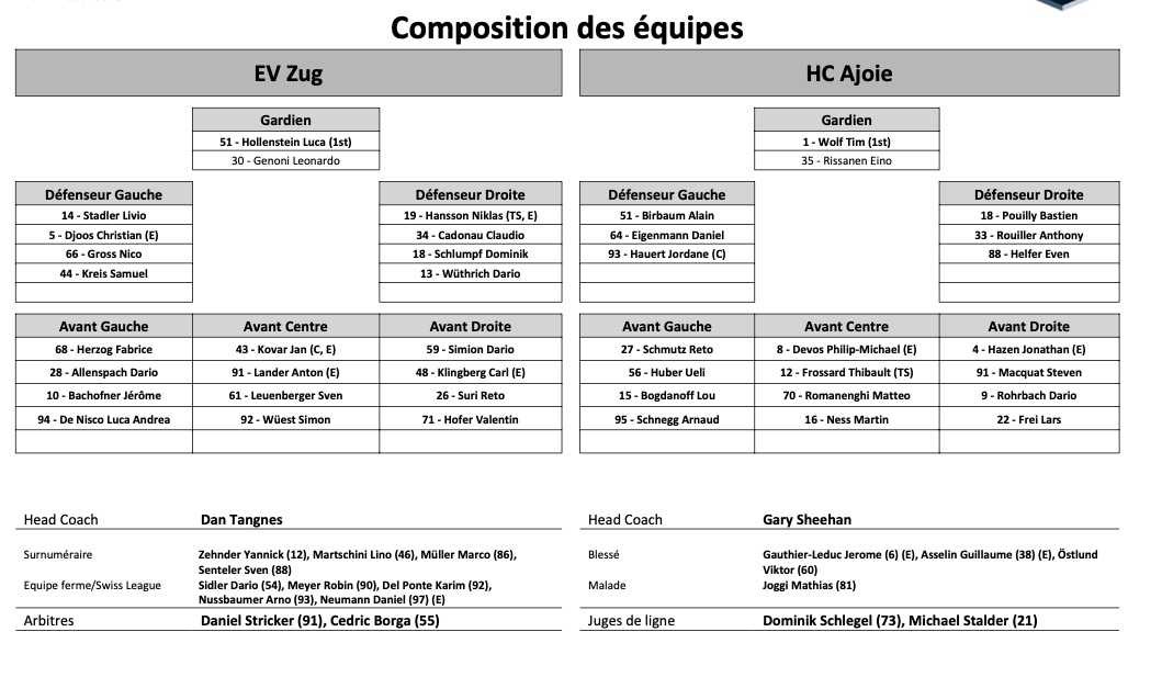 Formation des équipes et joueurs indisponibles pour le match Zoug vs Ajoie 24/09/2021 Follow SwissHabs Derniers articles Il y a 2 heures Les Islanders changent de cap : Peter DeBoer remplace Patrick Roy Il y a 8 heures Des sanctions contre Sandro Aeschlimann, Igor Jelovac, Marlon Graf et Julien Sprunger Il y a 9 heures Chris McSorley et Genève-Servette renvoyés dos à dos Il y a 10 heures Nicole Vallario et les Sirens jouent devant 18'000 fans dans une arène mythique Il y a 12 heures Andres Ambühl va prendre une place importante dans la Coupe Spengler