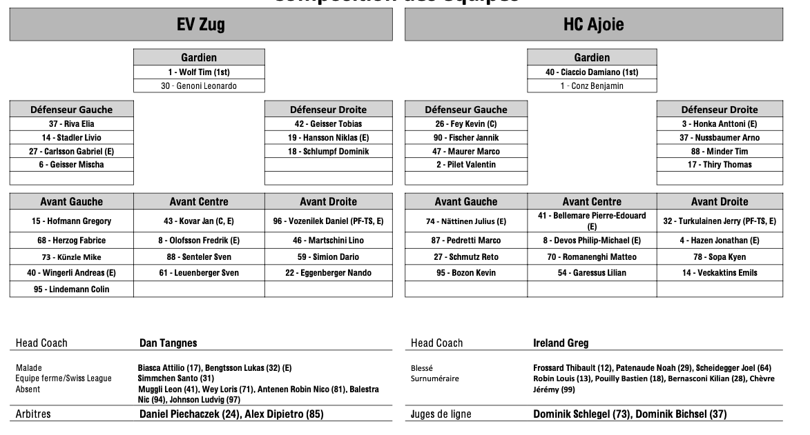 Formation des équipes et joueurs indisponibles pour le match Zoug vs Ajoie 21/12/2024 Follow SwissHabs Derniers articles Il y a 46 minutes Ajoie et... La Chaux-de-Fonds auraient bien accueilli Chris DiDomenico Il y a 2 heures Ambri officialise le divorce avec Chris DiDomenico Il y a 2 heures Lars Steiner espoir de la semaine en LHJMQ Il y a 4 heures Peter Cajka nous livre ses impressions sur cette fin de saison régulière Il y a 7 heures Chris DiDomenico ne devrait plus reporter le maillot d'Ambri