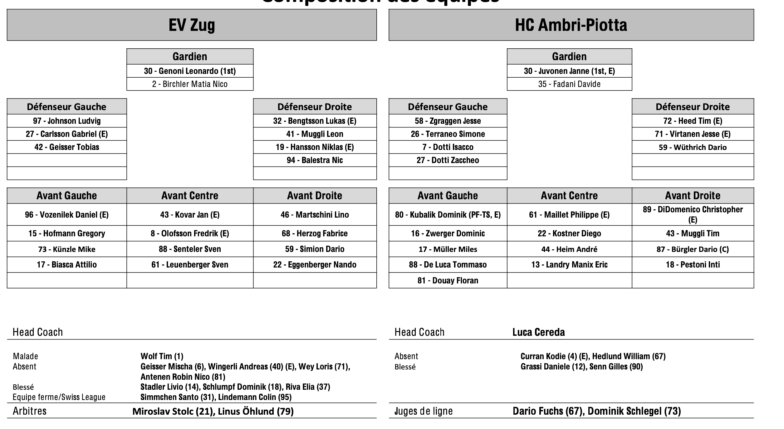 Formation des équipes et joueurs indisponibles pour le match Zoug vs Ambri 24/01/2025 Follow SwissHabs Derniers articles Il y a une heure Zoug dévoile son nouveau logo Il y a une heure Deux prolongations à Zurich Il y a 3 heures Formation des équipes et joueurs indisponibles pour le match Zurich vs Genève Il y a 4 heures Formation des équipes et joueurs indisponibles pour le match Davos vs Kloten Il y a 4 heures Formation des équipes et joueurs indisponibles pour le match Lugano vs Lausanne