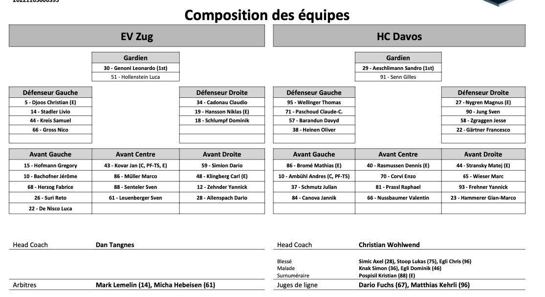 Formation des équipes et joueurs indisponibles pour le match Zoug vs Davos 12/04/2022 Follow SwissHabs Derniers articles Il y a 12 minutes Trois signatures cette nuit en NHL Il y a 38 minutes Alina Müller atteint les 50 points en PWHL Il y a une heure Les Suisses d'OHL victorieux Il y a une heure Les autres faits à retenir de cette nuit de NHL et de celle à venir Il y a une heure Une nuit à oublier pour les Suisses de NHL
