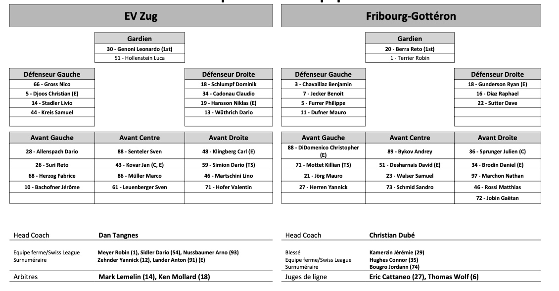 Formation des équipes et joueurs indisponibles pour le match Zoug vs Fribourg 18/09/2021 Follow SwissHabs Derniers articles Il y a 28 minutes Les autres faits à retenir de cette nuit de NHL et de celle à venir Il y a 45 minutes Dan Tangnes signe un bien bel exploit avec Rögle Il y a 59 minutes Une 21e saison à plus d'un point par match pour Sidney Crosby Il y a une heure Les Devils stoppent la série du Canadien Il y a une heure Saison terminée pour Maxime Sauthier, les Huskies devront passer par un septième match