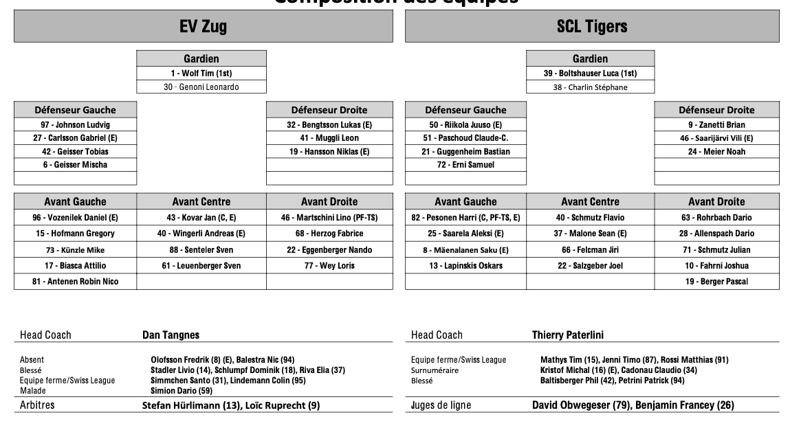 Formation des équipes et joueurs indisponibles pour le match Zoug vs Langnau 18/01/2025 Follow SwissHabs Derniers articles Il y a 15 minutes Ouverture d'une procédure ordinaire contre Malte Strömwall Il y a 39 minutes Emil Pettersson suscite de l'intérêt sur le marché suisse Il y a une heure Les autres faits à retenir de cette nuit de NHL et de celle à venir Il y a une heure Mauvais timing pour aller chercher sa crosse Il y a une heure Un combat de gardien en AHL