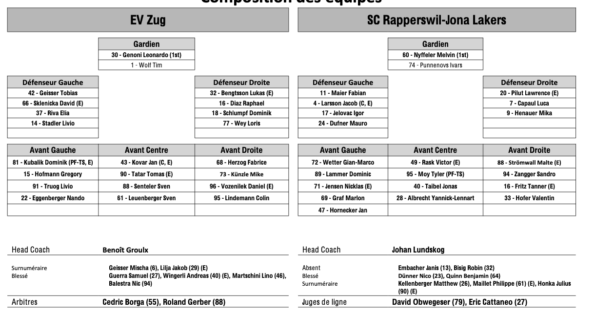 Formation des équipes et joueurs indisponibles pour le match Zoug vs Rapperswil 12/03/2026 Follow SwissHabs Derniers articles Il y a une heure Formation des équipes et joueurs indisponibles pour le match Bienne vs Berne Il y a une heure Formation des équipes et joueurs indisponibles pour le match Zoug vs Rapperswil Il y a 4 heures Lausanne pourrait être une option pour Lucas Wallmark Il y a 5 heures Du mouvement dans la relève zurichoise Il y a 5 heures Lugano : Dahlström reste jusqu’en 2028