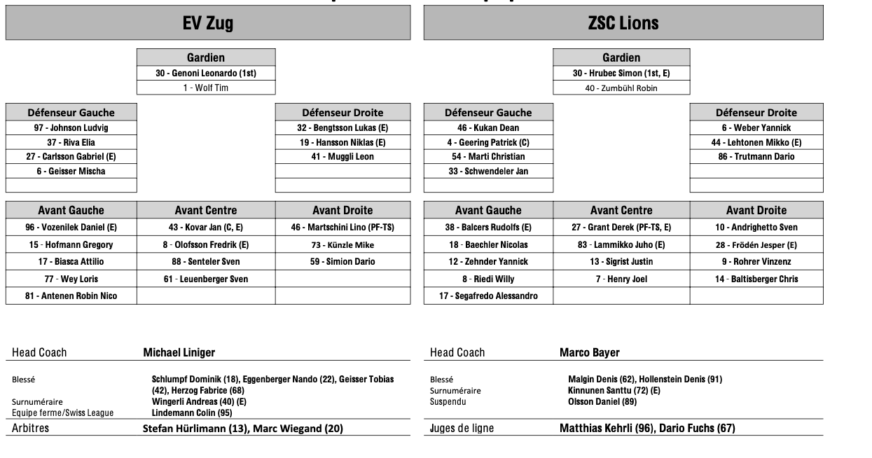 Formation des équipes et joueurs indisponibles pour le match Zoug vs Zurich 22/02/2025 Follow SwissHabs Derniers articles Il y a une heure Fribourg-Gottéron engage un nouvel étranger Il y a 4 heures Colin Lindemann prolonge son contrat avec Zoug jusqu'en 2028 Il y a 4 heures Jannik Fischer prendra sa retraite à la fin de la saison Il y a 4 heures Reto Berra de retour sur la glace Il y a 4 heures Langnau devenait champion suisse il y bientôt 50 ans