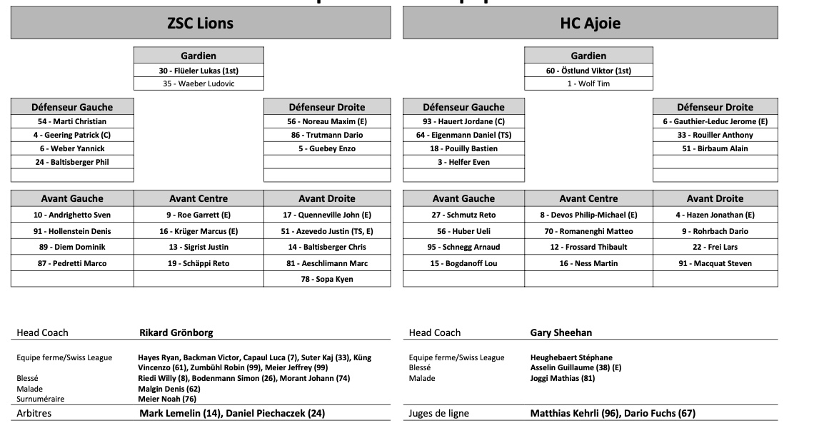 Formation des équipes et joueurs indisponibles pour le match Zurich vs Ajoie 17/09/2021 Follow SwissHabs Derniers articles Il y a une heure Avenir incertain pour Einar Emanuelsson après son passage à Lugano Il y a 2 heures Les autres faits à retenir de cette nuit de NHL et de celle à venir Il y a 3 heures Dan Tangnes signe un bien bel exploit avec Rögle Il y a 3 heures Une 21e saison à plus d'un point par match pour Sidney Crosby Il y a 3 heures Les Devils stoppent la série du Canadien