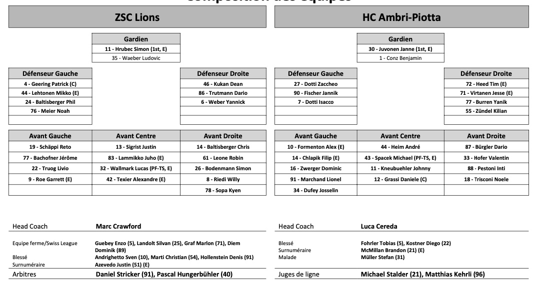 Formation des équipes et joueurs indisponibles pour le match Zurich vs Ambri 05/02/2023 Follow SwissHabs Derniers articles Il y a 2 heures La saison de NHL de Nino Niederreiter serait terminée Il y a 2 heures Les images des matchs de la soirée en National League Il y a 8 heures Formation des équipes et joueurs indisponibles pour le match Bienne vs Zoug Il y a 8 heures Formation des équipes et joueurs indisponibles pour le match Rapperswil vs Fribourg Il y a 8 heures Formation des équipes et joueurs indisponibles pour le match Kloten vs Langnau