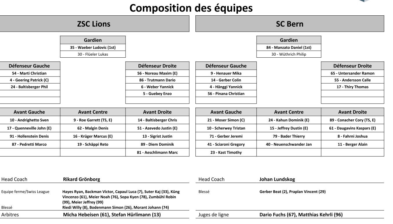 Formation des équipes et joueurs indisponibles pour le match Zurich vs Berne 02/10/2021 Follow SwissHabs Derniers articles Il y a une heure Cas Nemeth : le Tribunal du Sport de la Fédération rejette l’appel Il y a une heure Deux officialisations de contrat attendues du côté d'Ambri Il y a 2 heures Un avenir très incertain pour Denis Hollenstein Il y a 3 heures Plusieurs mouvements encore attendus autour du HC Bienne, mais Lucas Wallmark n'est pas concerné Il y a 4 heures Deux points pour Pius Suter dans la victoire des Blues