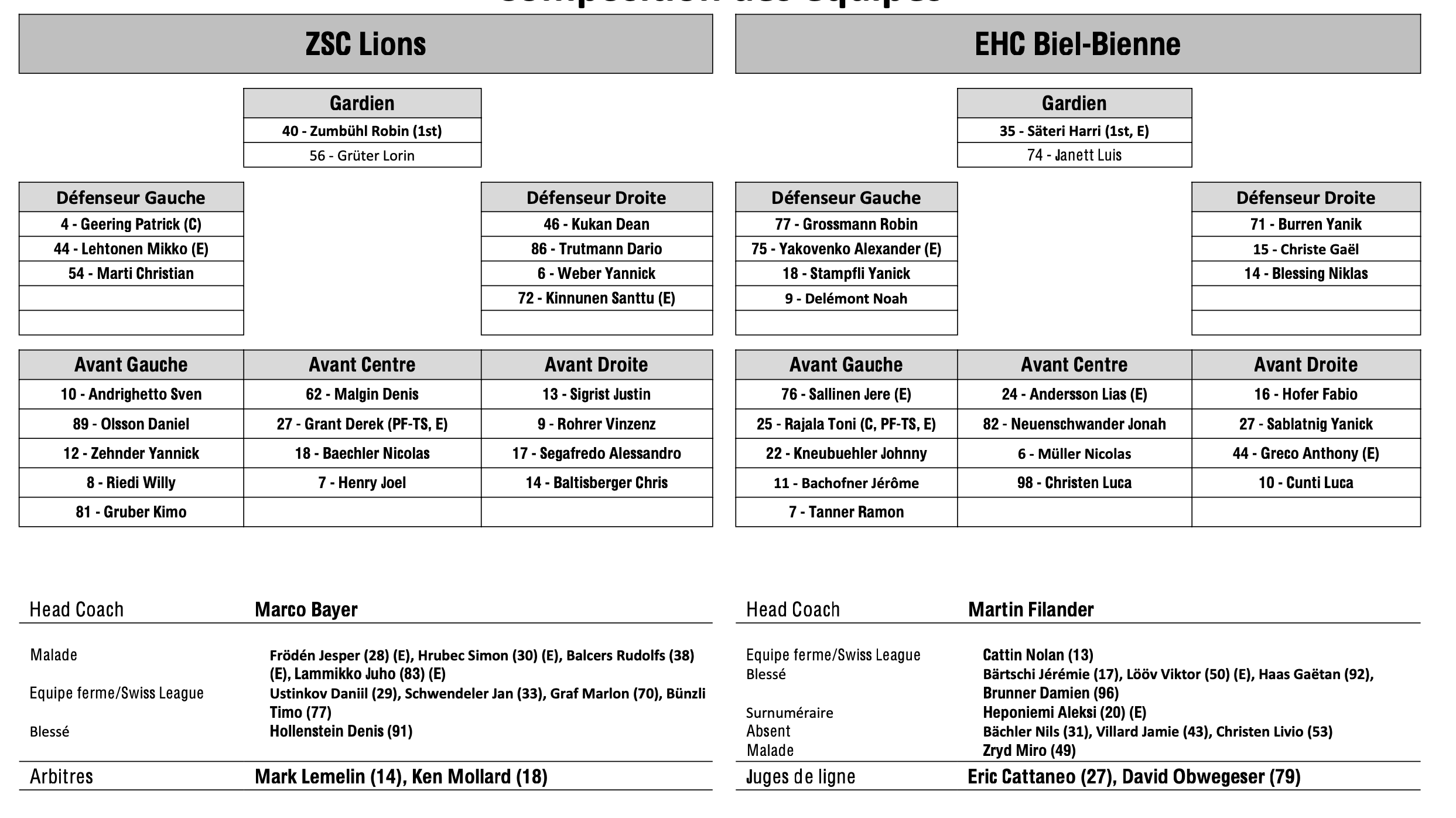 Formation des équipes et joueurs indisponibles pour le match Zurich vs Bienne 24/01/2025 Follow SwissHabs Derniers articles Il y a une heure Zoug dévoile son nouveau logo Il y a une heure Deux prolongations à Zurich Il y a 3 heures Formation des équipes et joueurs indisponibles pour le match Zurich vs Genève Il y a 4 heures Formation des équipes et joueurs indisponibles pour le match Davos vs Kloten Il y a 4 heures Formation des équipes et joueurs indisponibles pour le match Lugano vs Lausanne