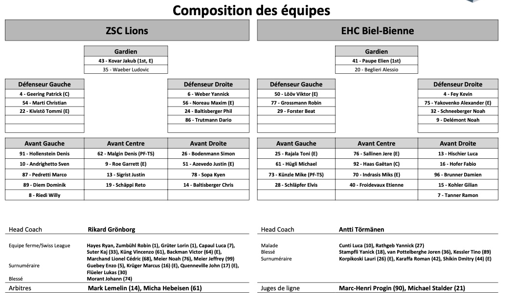 Formation des équipes et joueurs indisponibles pour le match Zurich vs Bienne 27/03/2022 Follow SwissHabs Derniers articles Il y a 6 minutes HC Ajoie : la liste des blessés s'amenuise Il y a 32 minutes Les détails des championnats du Monde Féminins 2026 Il y a une heure Radim Rulík quittera lui aussi son poste de sélectionneur ce printemps Il y a une heure Un point sur le poste de coach à Berne Il y a 4 heures Un contrat de longue durée pour Gaël Christe en Ajoie