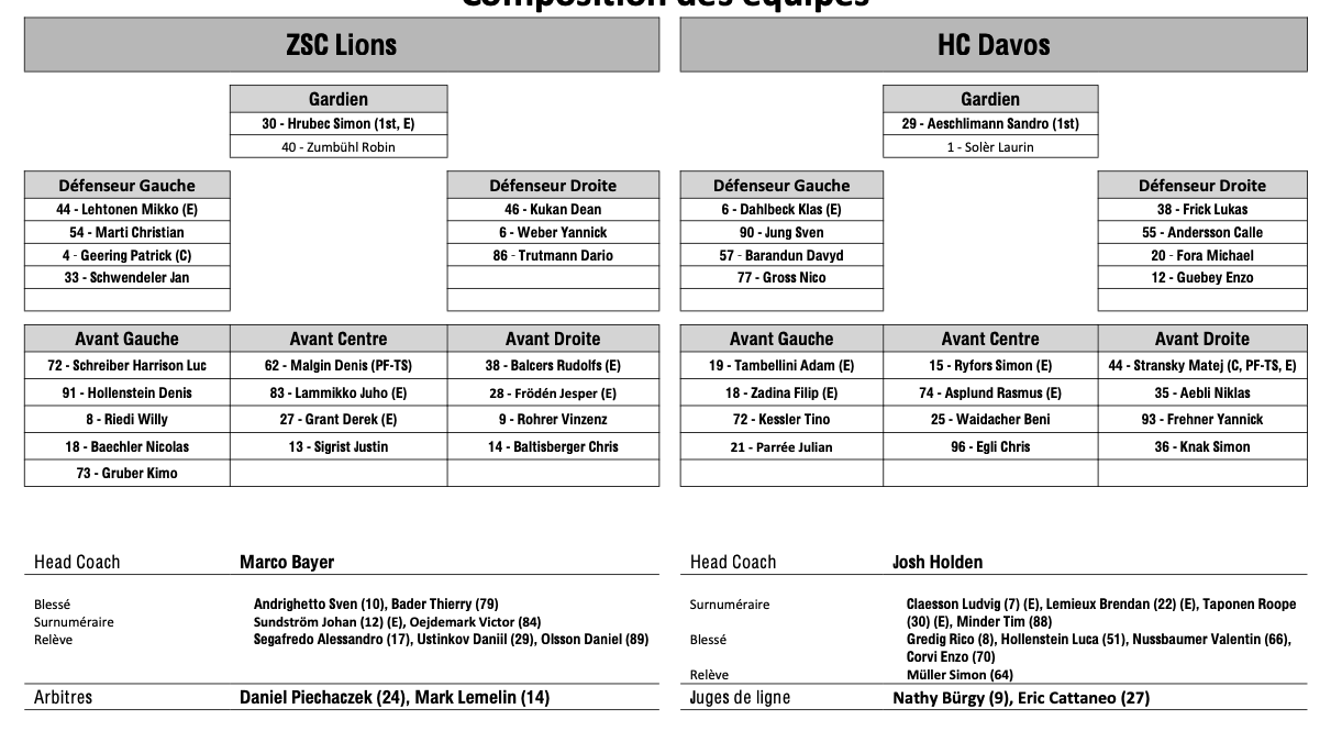 Formation des équipes et joueurs indisponibles pour le match Zurich vs Davos 06/04/2026 Follow SwissHabs Derniers articles Il y a une heure Formation des équipes et joueurs indisponibles pour le match Genève vs Fribourg Il y a une heure Formation des équipes et joueurs indisponibles pour le match Zurich vs Davos Il y a une heure Nino Niederreiter va pouvoir retrouver le jeu Il y a 2 heures Cristobal Huet et Thomas Wiesel invités de Drette su'l tape Il y a 3 heures Finales Elites : Bienne est champion U21, Zurich U18