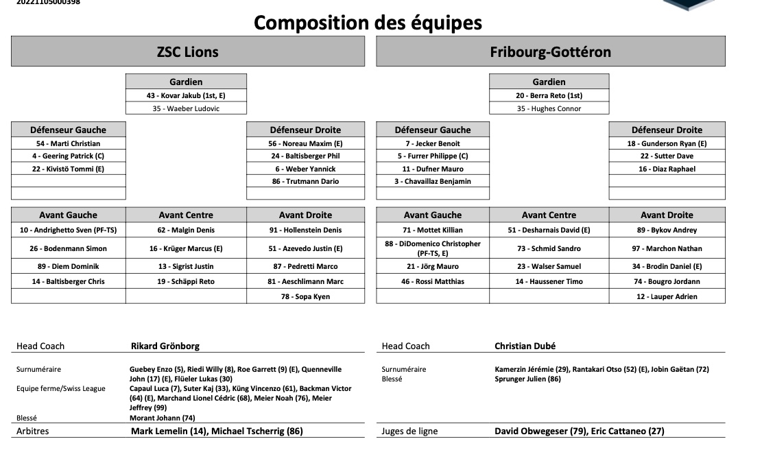 Formation des équipes et joueurs indisponibles pour le match Zurich vs Fribourg 14/04/2022 Follow SwissHabs Derniers articles Il y a 7 heures A voir : NHL My World, la série complète Il y a 12 heures Rien de grave pour Igor Chernyshov après cette terrible scène la nuit dernière Il y a 12 heures Simon Hrubec se développe en Suisse avec son initiative Saves Help Il y a 14 heures La fille d' Yves Sarault est une sacrée championne Il y a 15 heures Benjamin Rautiainen bat un record de Saku Koivu