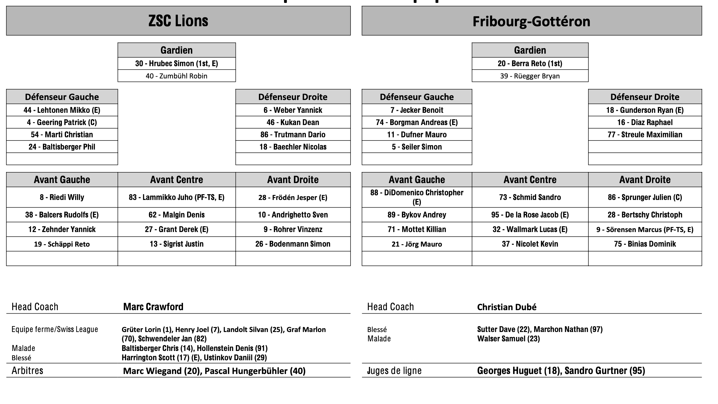 Formation des équipes et joueurs indisponibles pour le match Zurich vs Fribourg 23/12/2023 Follow SwissHabs Derniers articles Il y a 6 heures Formation des équipes et joueurs indisponibles pour le match Berne vs Fribourg Il y a 6 heures Formation des équipes et joueurs indisponibles pour le match Rapperswil vs Ambri Il y a 6 heures Formation des équipes et joueurs indisponibles pour le match Genève vs Kloten Il y a 6 heures Formation des équipes et joueurs indisponibles pour le match Davos vs Bienne Il y a 6 heures Formation des équipes et joueurs indisponibles pour le match Lausanne vs Ajoie