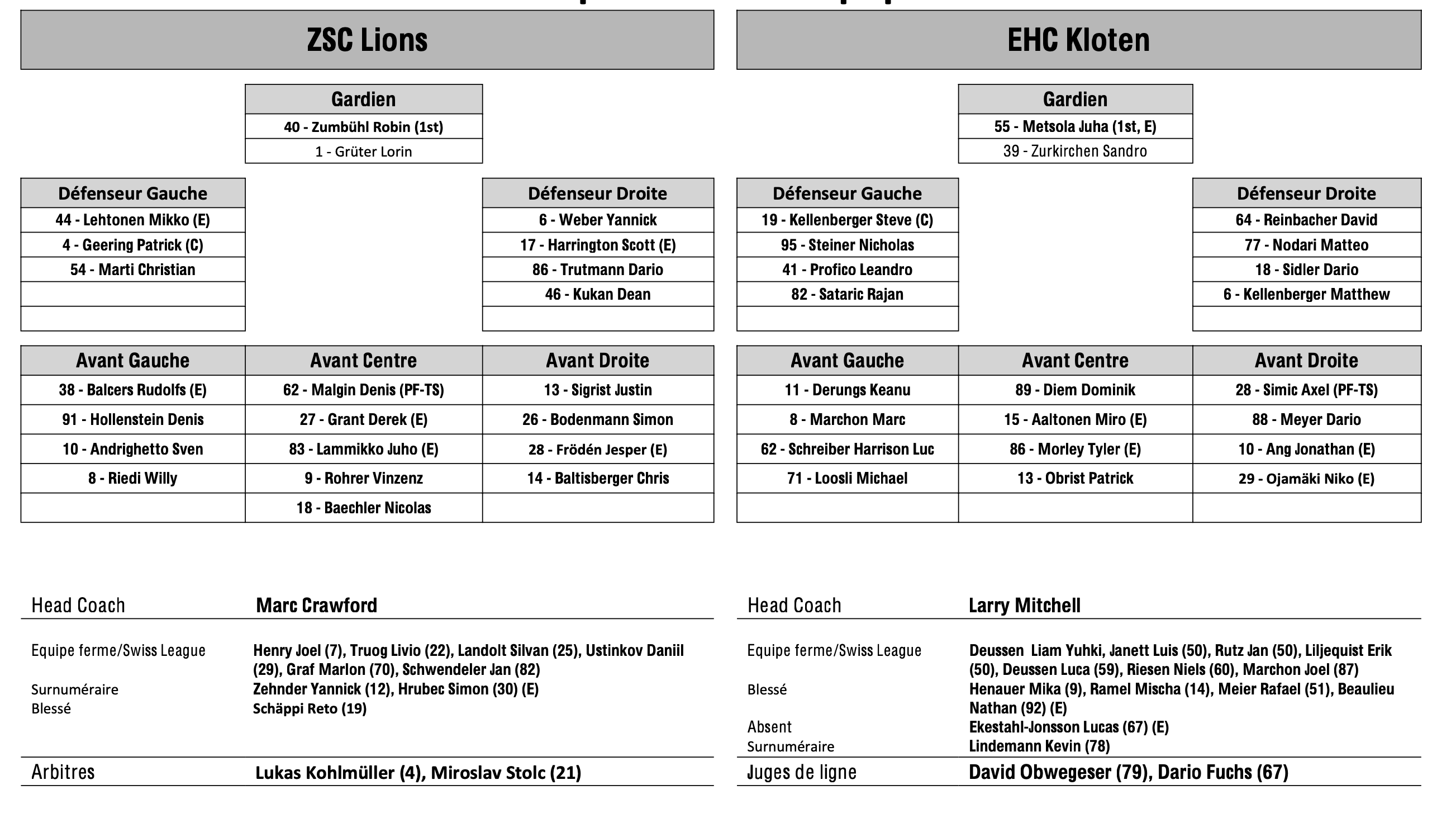 Formation des équipes et joueurs indisponibles pour le match Zurich vs Kloten 20/01/2024 Follow SwissHabs Derniers articles Il y a 45 minutes Des détails sur l'actionnariat de Fribourg-Gottéron Il y a une heure Lian Bichsel revient sur la période délicate qu'il a traversée lors de sa blessure Il y a 2 heures Loïc In-Albon prend quatre match de suspension Il y a 4 heures Les autres faits à retenir de cette nuit de NHL et de celle à venir Il y a 6 heures Jonathan Hazen devra patienter avant de connaître son avenir