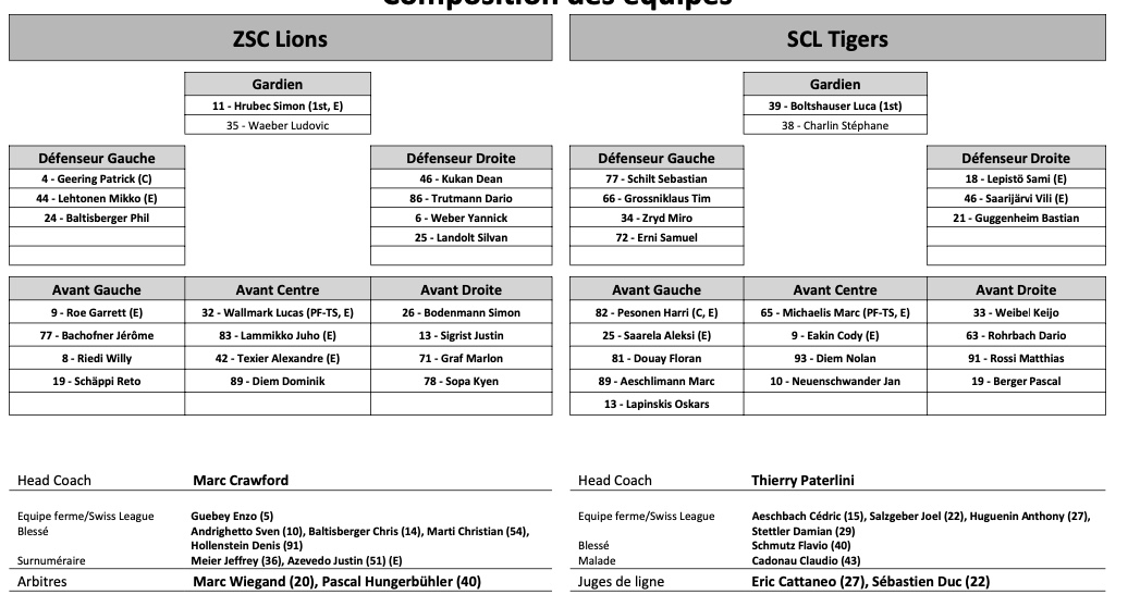 Formation des équipes et joueurs indisponibles pour le match Zurich vs Langnau 31/01/2023 Follow SwissHabs Derniers articles Il y a 27 minutes Christian Dubé fait le point sur ses débuts avec le HC Bienne Il y a 53 minutes Le combat de Jason Zucker vs Jonas Siegenthaler en images Il y a 2 heures Ian Michtell devrait rejoindre Berne la saison prochaine Il y a 6 heures Le point sur l'infirmerie du HC Bienne Il y a 7 heures Trois nouveaux intronisés au Hall of Fame de Genève