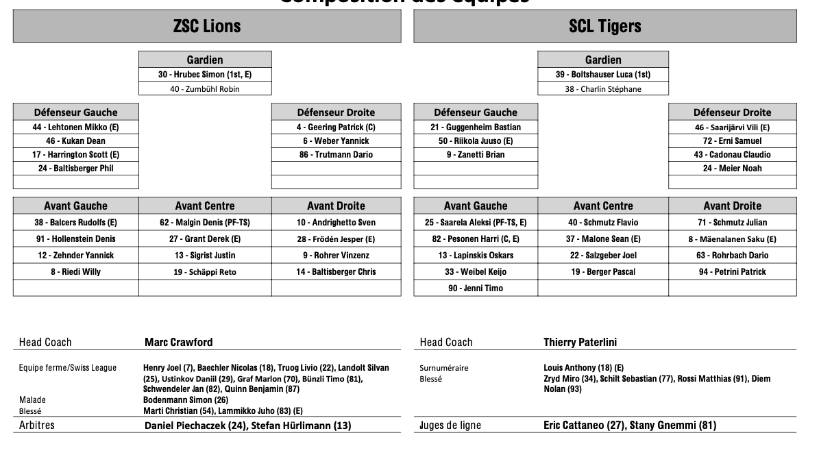 Formation des équipes et joueurs indisponibles pour le match Zurich vs Langnau 04/03/2024 Follow SwissHabs Derniers articles Il y a 6 heures Plusieurs joueurs touchés du côté de Davos Il y a 8 heures Kevin Fiala aura un nouveau coach Il y a 9 heures Pavel Rosa restera lui aussi derrière le banc du CP Berne Il y a 11 heures Simas Ignatavicius, itinéraire d’un enfant drafté Il y a 14 heures Les Swiss Devils célèbrent la cuisine helvète au New Jersey